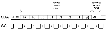 All transfers consist of a sequence of 8-bit bytes, with each byte followed by an acknowledge bit.